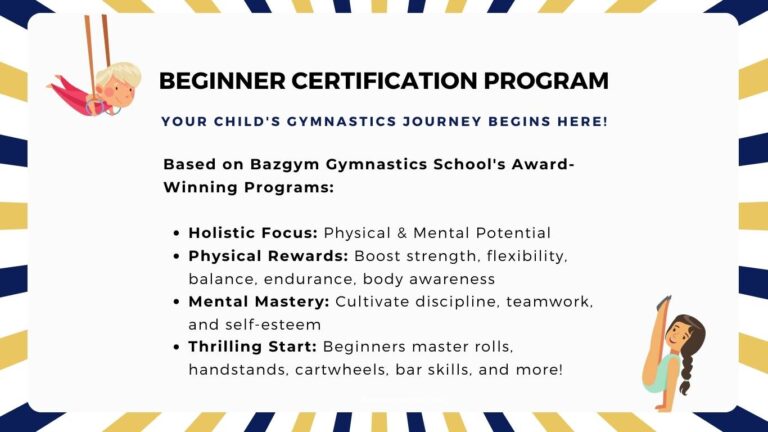 Join us in this empowering journey where your child’s physical and mental growth is at the heart of our Gymnastics Beginner Certification Program! Let’s embark on this exciting adventure together!