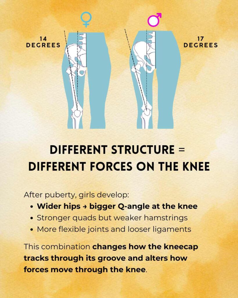 After puberty, women’s hips naturally widen. This changes the way force travels through the body — particularly at the knees and ankles.