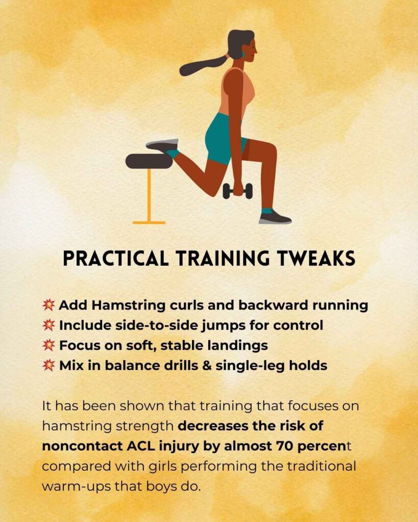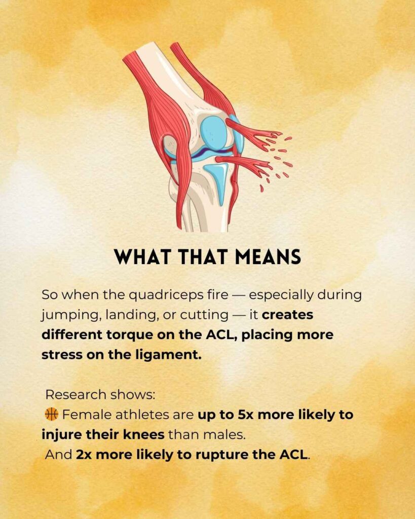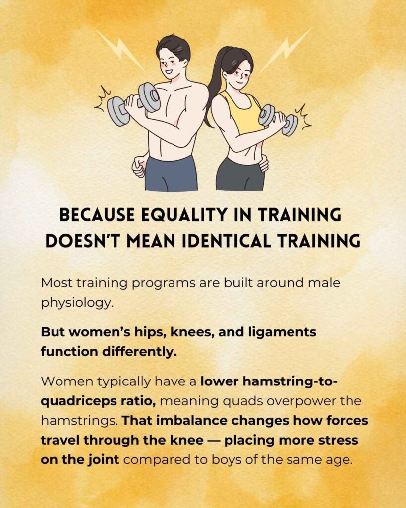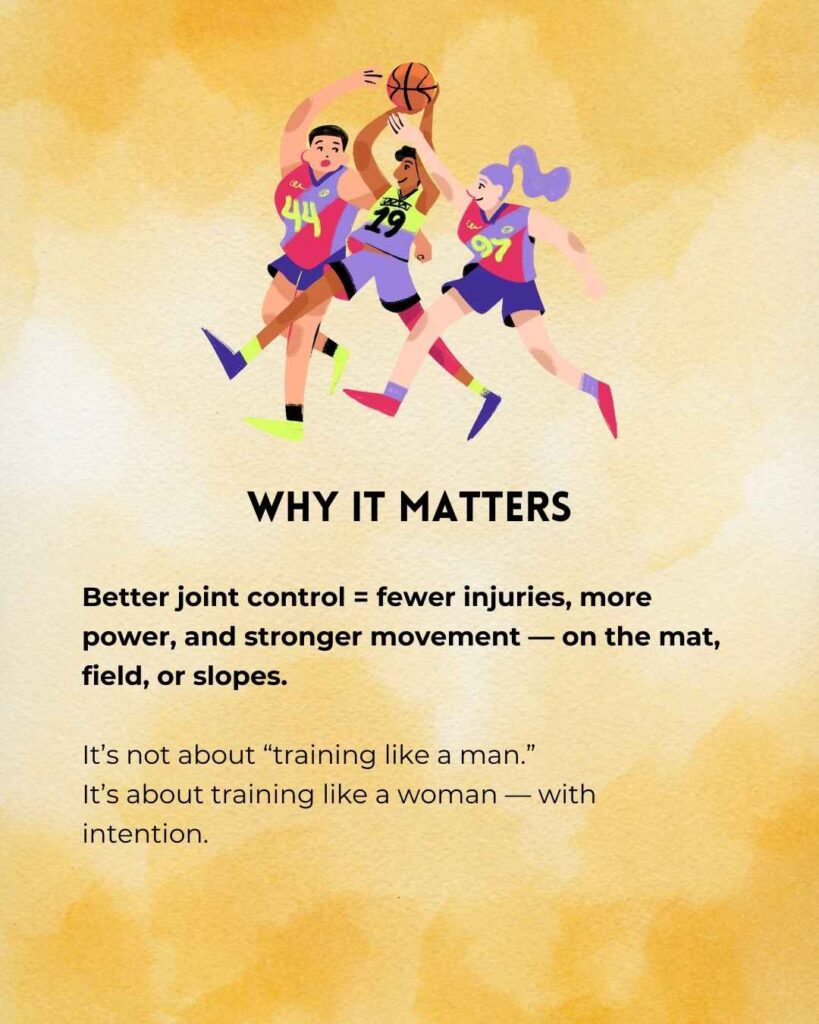 But women’s bodies have differences in structure, hormone cycles, and how we tend to recruit muscles during landing and direction changes. So the goal isn’t “train less hard.” It’s train smarter — with the right emphasis on control, alignment, and joint protection.